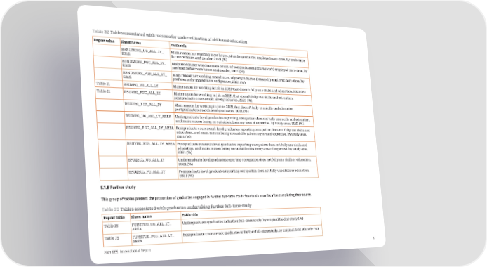 Table 32 Tables associated with reasons for underutilisation of skills and education Report table Sheet name Table title RSNOMORE_UG_ALL_1Y_ Main reason not working more hours, of undergraduates employed part-time, by preference E315 for more hours and gender, 2021 (%) RSNOMORE_PGC_ALL_1Y_ Main reason not working more hours, of postgraduates (coursework) employed part-time, by E315 preference for more hours and gender, 2021 (%) RSNOMORE_PGR_ALL_1Y_ Main reason not working more hours, of postgraduates (research) employed part-time, by E315 preference for more hours and gender, 2021 (%) Table 11 RSOVRQ_UG_ALL_1Y Main reason for working in job in 2021 that doesn’t fully use skills and education, 2021 (%) Table 11 RSOVRQ_PGC_ALL_1Y Main reason for working in job in 2021 that doesn’t fully use skills and education, postgraduate coursework level graduates, 2021 (%) RSOVRQ_PGR_ALL_1Y Main reason for working in job in 2021 that doesn’t fully use skills and education, postgraduate research level graduates, 2021 (%) RSOVRQ_UG_ALL_1Y_AREA Undergraduate level graduates reporting occupation does not fully use skills and education, and main reason being no suitable jobs in my area of expertise, by study area, 2021 (%) RSOVRQ_PGC_ALL_1Y_AREA Postgraduate coursework level graduates reporting occupation does not fully use skills and education, and main reason being no suitable jobs in my area of expertise, by study area, 2021 (%) RSOVRQ_PGR_ALL_1Y_AREA Postgraduate research level graduates reporting occupation does not fully use skills and education, and main reason being no suitable jobs in my area of expertise, by study area, 2021 (%) SPOQSCL_UG_ALL_1Y Undergraduate level graduates reporting occupation does not fully use skills or education, 2021 (%) SPOQSCL_PG_ALL_1Y Postgraduate level graduates reporting occupation does not fully use skills or education, 2021 (%) 6.1.8 Further study This group of tables present the proportion of graduates engaged in further full-time study four to six months after completing their course. Table 33 Tables associated with graduates undertaking further full-time study Report table Sheet name Table title Table 15 FURSTUD_UG_ALL_1Y_ Undergraduate graduates in further full-time study, by original field of study (%) AREA Table 15 FURSTUD_PGC_ALL_1Y_ Postgraduate coursework graduates in further full-time study, by original field of study (%) AREA 2021 GOS International Report 67