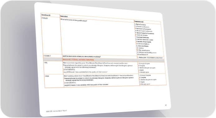 Question ID Item label Response scale FURLEV What is the level of this qualification? 1. Higher Doctorate 2. Doctorate by Research 3. Doctorate by Coursework 4. Master Degree by Research 5. Master Degree by Coursework 6. Graduate Diploma 7. Graduate Certificate 8. Bachelor (Honours) Degree 9. Bachelor (Pass) Degree 10. Advanced Diploma 11. Associate Degree 12. Diploma 13. Non-award course 14. Bridging and Enabling course 15. Certificate I-IV FURINST And the institution where you are currently studying? 1. USE FURINST LOOKUP LIST Module D2: OVERALL SATISFACTION/PREQ CEQ Now a question regarding your . 1. Strongly disagree Please indicate the extent to which you strongly disagree, disagree, neither agree nor disagree, agree or 2. Disagree strongly agree with the following statement. 3. Neither disagree nor agree (STATEMENTS) 4. Agree ceq149 Overall, I was satisfied with the quality of this 5. Strongly agree CEQB Now thinking about your . 1. Strongly disagree Please indicate the extent to which you strongly disagree, disagree, neither agree nor disagree, agree or 2. Disagree strongly agree the following statement. 3. Neither disagree nor agree (STATEMENTS) 4. Agree ceq249 Overall, I was satisfied with the quality of this 5. Strongly agree 2021 GOS International Report 49