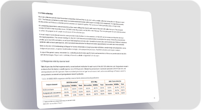 1.1.2 Data collection The main collection periods were November to December 2020 and May to July 2021, with a smaller collection taking place in February to April 2021. The February collection is undertaken to accommodate institutions with August to October 2020 completions. For reporting purposes, the November and February collection period outcomes are reported together. The survey was fielded primarily online, in English only. All completing respondents were entered into a four-week rolling prize draw in each round of the 2021 GOS collection cycle. The prize pool totalled $27,000 in the November round, $37,000 in the May round, and $6,000 in the February. The total prize pools for each collection aimed to reflect the proportion of sample in each round of the collection year. A broad range of promotional materials were provided to institutions to raise awareness of the GOS and encourage participation amongst the target population. The contact strategy for the 2021 GOS featured an email invitation to complete the survey, followed by nine reminder emails, up to two SMS reminders, as well as in field telephone reminder calls. Several institutions also commissioned post-fieldwork telephone reminder calls to boost participation, which extended data collection for these institutions approximately two weeks post main collection. Refer to the 2021 GOS Methodological Report for further information on target population definition, sample design and preparation, survey design and procedures, response maximisation strategies, data preparation processes, final field outcomes and response analysis. A copy of the generic survey instrument (i.e., excluding any institution specific items) and screenshots of the survey are included in the 2021 GOS Methodological Report and a summary of items is available in Appendix 3 of this report. 1.2 Response rate by course level Table 18 provides the final response rate by course level and institution for each round of the 2021 GOS collection cycle. Postgraduate research graduates had the highest overall response rate of 63.8 per cent, followed by postgraduate coursework graduates with 33.0 per cent, and undergraduates with 32.2 per cent. Some variation by institution type for each course level can be seen, with larger differences noted for postgraduate coursework and postgraduate research graduates. Table 18 2021 GOS response rate by course level, international graduates 2 2020 November 2021 May 2021 Total collection Project element Universities NUHEIs Total Universities NUHEIs Total Universities NUHEIs Total Undergraduate 30.1% 32.5% 30.5% 33.2% 36.7% 33.6% 31.9% 34.2% 32.2% Postgraduate coursework 32.4% 37.4% 33.1% 32.0% 46.7% 32.8% 32.2% 39.7% 33.0% Postgraduate research 62.9% 0.0% 62.9% 65.4% 66.7% 65.4% 63.8% 50.0% 63.8% 2 Includes February supplementary round outcomes 2021 GOS International Report 26