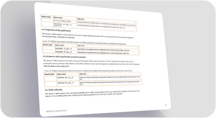 Report table Sheet name Table title OCC_UG_UNI_1Y_AREA Undergraduate occupation level, total employed, by study area, universities only, 2021 (%) BROADOCC_UG_ALL_1Y_ Undergraduate occupation level, total employed, by study area, 2021 (%) EMPTYPE 6.1.5 Importance of the qualification This group of tables presents information on the extent to which graduates consider that it was important for them to have their specific or similar qualification, to be able to do their job. Table 30 Tables associated with the extent to which graduates considered their qualification important Report table Sheet name Table title QUALIMP_UG_ALL_1Y Importance of qualification for undergraduates’ current employment, 2021 (%) QUALIMP_PG_ALL_1Y Importance of qualification for postgraduates’ current employment, 2021 (%) 6.1.6 Extent to which qualification prepared graduates This group of tables present information on how well the qualification prepared graduates for their current job. Institutions also receive qualitative data in comment fields related to what the institution did well and what graduates considered could have been done better to prepare them for their current employment. Table 31 Tables associated with the extent to which the qualification prepared graduates for their current job Report table Sheet name Table title CRSPREP_UG_ALL_1Y Extent to which qualification prepared undergraduate level graduates for employment, 2021 (%) CRSPREP_PG_ALL_1Y Extent to which qualification prepared postgraduate level graduates for employment, 2021 (%) 6.1.7 Skills utilisation This group of tables present data exploring underutilisation of skills among graduates four to six months after completion of their course, and reasons for not working more hours. Results can be viewed by preference for more hours, gender, and study area. 2021 GOS International Report 66