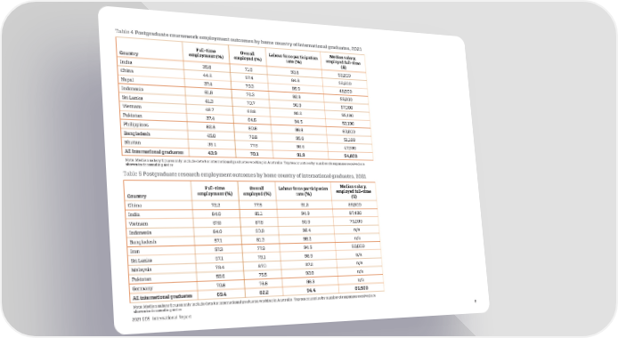 Table 4 Postgraduate coursework employment outcomes by home country of international graduates, 2021 Full-time Overall Labour force participation Median salary, employment (%) employed (%) rate (%) employed full-time Country ($) India 35.8 71.6 93.8 52,200 China 44.2 57.4 84.8 52,200 Nepal 37.4 79.3 95.9 48,000 Indonesia 61.9 72.3 92.9 55,000 Sri Lanka 41.3 70.7 90.9 57,000 Vietnam 48.7 69.6 90.2 55,100 Pakistan 37.4 64.6 94.5 53,100 Philippines 62.8 80.6 96.6 60,000 Bangladesh 45.0 76.8 95.6 51,100 Bhutan 35.1 77.6 96.6 47,600 All international graduates 43.9 70.1 91.9 54,800 Note: Median salary figures only include data for international graduates working in Australia. Top ten countries by number of responses received are shown in descending order. Table 5 Postgraduate research employment outcomes by home country of international graduates, 2021 Full-time Overall Labour force participation Median salary, employment (%) employed (%) rate (%) employed full-time Country ($) China 72.2 77.5 91.3 86,900 India 64.0 81.1 94.9 87,400 Vietnam 67.0 87.8 93.9 75,000 Indonesia 84.0 90.9 98.4 n/a Bangladesh 57.1 81.3 98.2 n/a Iran 57.3 77.9 94.5 90,000 Sri Lanka 67.1 79.1 98.9 n/a Malaysia 79.4 87.0 97.2 n/a Pakistan 59.6 75.5 93.0 n/a Germany 70.8 78.8 96.3 n/a All international graduates 69.4 82.2 94.4 86,900 Note: Median salary figures only include data for international graduates working in Australia. Top ten countries by number of responses received are shown in descending order. 2021 GOS International Report 8