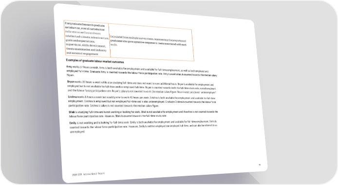 Postgraduate Research graduate satisfaction, overall satisfaction indicator as well as scales on Calculated from multiple survey items, representing the proportion of intellectual climate, infrastructure, graduates who gave a positive response to items associated with each goals and expectations, scale. supervision, skills development, thesis examination and industry and external engagement Examples of graduate labour market outcomes Amy works 37 hours a week. Amy is both available for employment and available for full-time employment, as well as both employed and employed full-time. Graduate Amy is counted towards the labour force participation rate. Amy’s usual salary is counted towards the median salary figure. Bryan works 20 hours a week while also studying full-time and does not want to work additional hours. Bryan is available for employment and employed but is not available for full-time work or employed full-time. Bryan is counted towards both the full-time study rate, overall employed and the labour force participation rate. Bryan’s salary is not counted towards the median salary figure. Bryan is not considered “underemployed”. Crishna works 6 hours a week but would prefer to work 40 hours per week. Crishna is both available for employment and available for full-time employment. Crishna is employed but not employed full-time and is also underemployed. Graduate Crishna is counted towards the labour force participation rate. Crishna’s salary is not counted towards the median salary figure. Dilek is studying full-time and is not working or looking for work. Dilek is not available for employment and therefore is not counted towards the labour force participation rate. However, Dilek is counted towards the full-time study rate. Emily is not working and is looking for full-time work. Emily is both available for employment and available for full-time employment. Emily is counted towards the labour force participation rate. However, Emily is neither employed nor employed full-time, and can also be referred to as unemployed. 2021 GOS International Report 36
