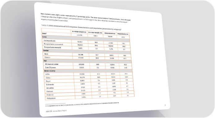 Male students were slightly under-represented by 1.1 percentage points. The under-representation of Chinese graduates, those who speak a language other than English at home, and young graduates in 2021 suggests that these should be considered as areas for renewed response maximisation focus in 2022. Table 21 2021 International GOS response characteristics and population parameters by subgroup* In-scope sample (n) In-scope sample (%) Respondents (n) Respondents (%) 5 Base 113,678 100.0 38,188 100.0 Level Undergraduate 41,620 36.6 13,392 35.1 Postgraduate coursework 68,643 60.4 22,618 59.2 Postgraduate research 3,415 3.0 2,178 5.7 Gender Male 56,398 49.7 18,514 48.6 Female 57,045 50.3 19,605 51.4 Age 30 years or under 103,168 90.8 32,643 85.5 Over 30 years 10,510 9.2 5,545 14.5 Home country India 20,856 18.3 8,523 22.3 China 44,078 38.8 9,005 23.6 Nepal 8,392 7.4 3,451 9.0 Indonesia 2,968 2.6 1,187 3.1 Sri Lanka 2,512 2.2 1,049 2.7 Vietnam 3,435 3.0 1,316 3.4 Pakistan 1,919 1.7 701 1.8 Philippines 1,434 1.3 807 2.1 5 Components may not sum to base number, as records with unknown characteristics are not included in the sub-categories. 2021 GOS International Report 32