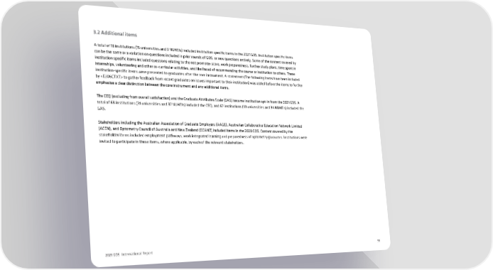 3.2 Additional items A total of 18 institutions (15 universities and 3 NUHEIs) included institution specific items in the 2021 GOS. Institution specific items can be the same or a variation on questions included in prior rounds of GOS, or new questions entirely. Some of the content covered by institution specific items included questions relating to the net promoter score, work preparedness, further study plans, time spent in internships, volunteering and other co-curricular activities, and likelihood of recommending the course or institution to others. These institution-specific items were presented to graduates after the core instrument. A statement (The following items have been included by to gather feedback from recent graduates on issues important to their institution) was added before the items to further emphasise a clear distinction between the core instrument and any additional items. The CEQ (excluding from overall satisfaction) and the Graduate Attributes Scale (GAS) became institution opt-in from the 2021 GOS. A total of 68 institutions (31 universities and 37 NUHEIs) included the CEQ, and 67 institutions (33 universities and 34 NUHEIs) included the GAS. Stakeholders including the Australian Association of Graduate Employers (AAGE), Australian Collaborative Education Network Limited (ACEN), and Optometry Council of Australia and New Zealand (OCANZ) included items in the 2020 GOS. Content covered by the stakeholder items included employment pathways, work integrated learning and preparedness of optometry graduates. Institutions were invited to participate in these items, where applicable, by each of the relevant stakeholders. 2021 GOS International Report 56