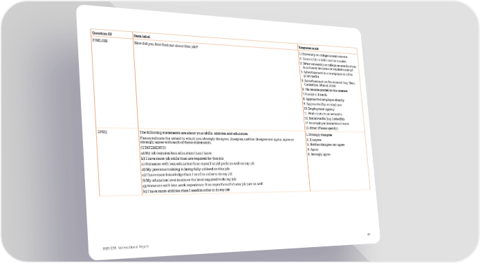 Question ID Item label Response scale FINDJOB How did you first find out about this job? 1. University or college careers service 2. Careers fair or information session 3. Other university or college source (such as faculties or lecturers or student society) 4. Advertisement in a newspaper or other print media 5. Advertisement on the internet (e.g. Seek, CareerOne, Ethical Jobs) 6. Via resume posted on the internet 7. Family or friends 8. Approached employer directly 9. Approached by an employer 10. Employment agency 11. Work contacts or networks 12. Social media (e.g. LinkedIn) 17. An employer promotional event 13. Other (Please specify) SPOQ The following statements are about your skills, abilities and education. 1. Strongly disagree Please indicate the extent to which you strongly disagree, disagree, neither disagree nor agree, agree or 2. Disagree strongly agree with each of these statements. 3. Neither disagree nor agree (STATEMENTS) 4. Agree a) My job requires less education than I have 5. Strongly agree b) I have more job skills than are required for this job c) Someone with less education than myself could perform well on my job d) My previous training is being fully utilised on this job e) I have more knowledge than I need in order to do my job f) My education level is above the level required to do my job g) Someone with less work experience than myself could do my job just as well h) I have more abilities than I need in order to do my job 2021 GOS International Report 47