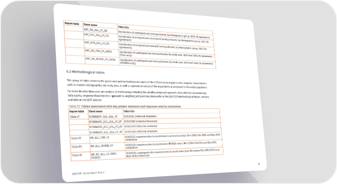 Report table Sheet name Table title SAT_UG_ALL_1Y_DG Satisfaction of undergraduate level graduates, by demographic group, 2021 (% agreement) SAT_PGC_ALL_1Y_DG Satisfaction of postgraduate coursework level graduates, by demographic group, 2021 (% agreement) SAT_PGR_ALL_1Y_DG Satisfaction of postgraduate research level graduates, by demographic group, 2021 (% agreement) SAT_UG_UNI_2Y_AREA Satisfaction of undergraduate level graduates, by study area, 2020 and 2021 (% agreement) (Unis only) SAT_UG_NUHEI_2Y_AREA Satisfaction of undergraduate level graduates, by study area, 2020 and 2021 (% agreement) (NUHEIs only) 6.2 Methodological tables This group of tables relate to the operational and methodological aspects of the GOS including response rates, response characteristics such as student demographics and study area, as well as representativeness of the respondents as compared to the sample population. For more detailed discussion and analysis of methodology including the sampling design and approach, data collection and processing, data quality, response characteristics, approach to weighting and precision please refer to the 2021 GOS Methodological Report, which is available on the QILT website. Table 35 Tables associated with key project elements and response rates by institution Report table Sheet name Table title Table 17 SUMMARY_ALL_ALL_1Y GOS 2021 Collection Summary SUMMARY_ALL_ALL_1Y_1P GOS 2020 Collection Summary SUMMARY_ALL_ALL_1Y_2P GOS 2019 Collection summary SUMMARY_ALL_ALL_1Y_3P GOS 2018 Collection summary Table 19 RR_ALL_UNI_1Y GOS 2021 response rates by institution (universities only), Nov 2020, Feb 2021 and May 2021 collections Table 20 RR_ALL_NUHEI_1Y GOS 2021 response rates by institution (NUHEIs only), Nov 2020, Feb 2021 and May 2021 collections Table 18 RR_UG_ALL_1Y_INST_ GOS 2021 undergraduate response rates by institution type, November/Feb 2020/2021 and PERIOD May 2021 collections 2021 GOS International Report 69