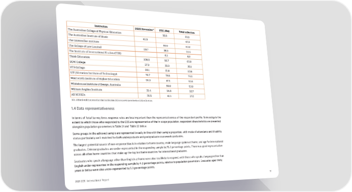 4 Institution 2020 November 2021 May Total collection The Australian College of Physical Education 33.3 33.3 The Australian Institute of Music 42.9 42.9 The Cairnmillar Institute 80.0 80.0 The College of Law Limited 29.7 38.3 32.4 The Institute of International Studies (TIIS) 8.3 8.3 Think Education 100.0 66.7 80.0 UOW College 37.9 33.3 35.1 UTS College 20.1 21.6 20.8 VIT (Victorian Institute of Technology) 75.7 76.5 76.2 Wentworth Institute of Higher Education 56.3 47.1 50.6 Whitehouse Institute of Design, Australia 50.0 50.0 William Angliss Institute 31.4 34.0 32.7 All NUHEIs 35.5 41.1 37.2 NB: A blank cell denotes that the institution did not participate in that GOS collection 1.4 Data representativeness In terms of Total Survey Error, response rates are less important than the representativeness of the respondent profile. To investigate the extent to which those who responded to the GOS are representative of the in-scope population, respondent characteristics are presented alongside population parameters in Table 21 and Table 22 below. Some groups in the achieved sample are represented broadly in-line with their sample proportion, with mode of attendance and disability status particularly well-matched for both undergraduate and postgraduate coursework graduates. The largest potential source of non-response bias is in relation to home country, main language spoken at home, and age for international graduates. Chinese graduates are under-represented in the responding sample by 15.2 percentage points. There was good representation across all other home countries that make up the top ten home countries for international graduates. Graduates who speak a language other than English at home were also less likely to respond, with those who speak a language other than English under-represented in the responding sample by 4.2 percentage points, relative to population parameters. Graduates aged thirty years or below were also under-represented by 5.3 percentage points. 2021 GOS International Report 31