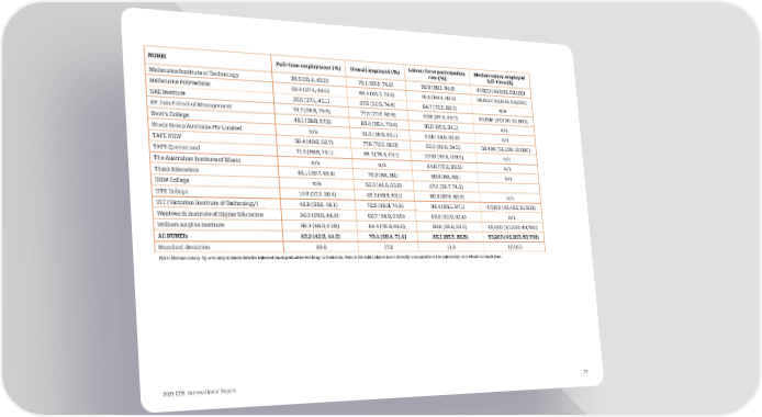 NUHEI Full-time employment (%) Overall employed (%) Labour force participation Median salary, employed rate (%) full-time ($) Melbourne Institute of Technology 36.5 (31.4, 42.0) 70.1 (65.5, 74.2) 92.9 (90.1, 94.8) 47,500 (44,900, 50,100) Melbourne Polytechnic 42.6 (37.4, 48.0) 69.6 (64.7, 73.8) 91.5 (88.4, 93.6) 50,000 (46,800, 53,200) SAE Institute 35.5 (27.1, 45.1) 67.5 (59.5, 74.4) 84.7 (78.5, 89.0) n/a SP Jain School of Management 73.7 (66.5, 79.5) 77.2 (70.5, 82.5) 93.5 (88.9, 96.0) 50,500 (47,500, 53,500) Stott's College 48.1 (38.8, 57.6) 63.4 (55.4, 70.4) 91.0 (85.2, 94.1) n/a Study Group Australia Pty Limited n/a 51.4 (38.5, 64.1) 53.8 (44.6, 62.8) n/a TAFE NSW 56.4 (49.8, 62.7) 77.8 (72.5, 82.0) 92.3 (88.6, 94.5) 58,400 (56,100, 60,800) TAFE Queensland 71.0 (59.5, 79.1) 85.3 (75.3, 90.1) 100.0 (92.6, 100.0) n/a The Australian Institute of Music n/a n/a 84.6 (72.2, 90.5) n/a Think Education 44.1 (39.7, 49.4) 79.3 (NA, NA) 86.6 (NA, NA) n/a UOW College n/a 53.3 (42.5, 63.8) 67.2 (58.7, 74.3) UTS College 14.6 (10.3, 20.4) 49.3 (45.5, 53.1) 60.3 (57.5, 63.0) n/a VIT (Victorian Institute of Technology) 42.8 (39.6, 46.1) 72.5 (69.9, 74.8) 96.4 (95.0, 97.1) 47,000 (42,400, 51,500) Wentworth Institute of Higher Education 34.0 (25.6, 44.3) 62.7 (54.9, 69.5) 89.3 (83.5, 92.4) n/a William Angliss Institute 56.3 (48.3, 63.8) 84.4 (78.3, 88.6) 90.6 (85.6, 93.5) 45,000 (40,300, 49,700) All NUHEIs 43.2 (42.0, 44.6) 70.4 (69.4, 71.4) 86.1 (85.5, 86.8) 50,000 (49,300, 50,700) Standard deviation 25.2 17.2 11.3 12,400 Note: Median salary figures only include data for international graduates working in Australia. Data in the table above is not directly comparable to the university data which is single year. 2021 GOS International Report 17
