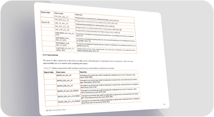 Report table Sheet name Table title FTE_PGC_ALL_TS Postgraduate coursework full-time employment, 2016-2021 (%) FTE_PGR_ALL_TS Postgraduate research full-time employment, 2016-2021 (%) Figure 02 SAL_UG_ALL_TS Undergraduate median full-time salaries, 2016-2021 ($) SAL_PGC_ALL_TS Postgraduate coursework median full-time salaries, 2016-2021 ($) SAL_PGR_ALL_TS Postgraduate research median full-time salaries, 2016-2021 ($) PREFMHRS_UG_ALL_1Y_ Proportion of employed undergraduates seeking or not seeking more hours, by gender, E315 2021 (%) PREFMHRS_PGC_ Proportion of employed postgraduates (coursework) seeking or not seeking more hours, ALL_1Y_E315 by gender, 2021 (%) PREFMHRS_PGR_ Proportion of employed postgraduates (research) seeking or not seeking more hours, by ALL_1Y_E315 gender, 2021 (%) PARTEMP_UG_ALL_1Y_ Undergraduate Part-time employment, by study area and gender, as a proportion of all AREA_SEX employed graduates, 2021 (%) 6.1.2 Hours worked This group of tables explores the median hours actually worked in the week prior to completing the survey of graduates in the short-term, approximately four to six months after completing their course. Table 27 Tables associated with median usual hours and median actual hours worked Report table Sheet name Table title HOURS_UG_ALL_3Y Average hours worked per week for employed undergraduates by full-time/part-time status, 2019-2021 HOURS_PGC_ALL_3Y Average hours worked per week for employed postgraduates (coursework) by full-time/ part-time status, 2019-2021 HOURS_PGR_ALL_3Y Average hours worked per week for employed postgraduates (research) by full-time/part- time status, 2019-2021 HOURS_UG_ALL_3Y_PERIOD Average hours worked per week for employed undergraduates by full-time/part-time status and survey round, 2019-2021 HOURS_PGC_ALL_3Y_PERIOD Average hours worked per week for employed postgraduates (coursework) by full-time/ part-time status and survey round, 2019-2021 HOURS_PGR_ALL_3Y_PERIOD Average hours worked per week for employed postgraduates (research) by full-time/part- time status and survey round, 2019-2021 2021 GOS International Report 64