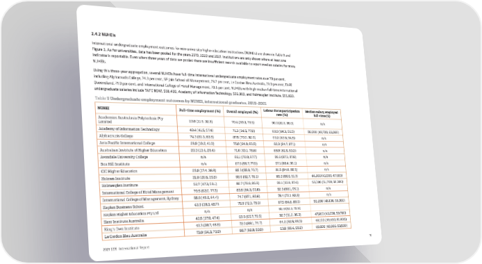 2.4.2 NUHEIs International undergraduate employment outcomes for non-university higher education institutions (NUHEIs) are shown in Table 9 and Figure 3. As for universities, data has been pooled for the years 2019, 2020 and 2021. Institutions are only shown where at least one indicator is reportable. Even when three years of data are pooled there are insufficient records available to report median salaries for many NUHEIs. Using this three-year aggregation, several NUHEIs have full-time international undergraduate employment rates over 70 per cent, including Alphacrucis College, 74.3 per cent, SP Jain School of Management, 73.7 per cent, Le Cordon Bleu Australia, 73.0 per cent, TAFE Queensland, 71.0 per cent, and International College of Hotel Management, 70.5 per cent. NUHEIs with high median full-time international undergraduate salaries include TAFE NSW, $58,400, Academy of Information Technology, $56,000, and Holmesglen Institute, $55,000. Table 9 Undergraduate employment outcomes by NUHEI, international graduates, 2019-2021 NUHEI Full-time employment (%) Overall employed (%) Labour force participation Median salary, employed rate (%) full-time ($) Academies Australasia Polytechnic Pty 20.0 (11.5, 32.3) 70.4 (59.3, 79.5) 90.0 (81.6, 95.0) n/a Limited Academy of Information Technology 49.4 (41.5, 57.4) 71.3 (64.5, 77.0) 89.3 (84.3, 92.5) 56,000 (48,700, 63,300) Alphacrucis College 74.3 (61.3, 83.8) 87.5 (79.0, 92.6) 90.3 (82.8, 94.5) n/a Asia Pacific International College 28.9 (19.2, 41.0) 75.0 (64.0, 83.5) 92.9 (84.7, 97.1) n/a Australian Institute of Higher Education 20.3 (13.4, 29.4) 71.6 (63.1, 78.8) 88.9 (82.5, 93.2) n/a Avondale University College n/a 82.1 (70.9, 87.7) 96.6 (87.3, 97.8) n/a Box Hill Institute n/a 67.6 (55.7, 77.0) 97.1 (88.4, 99.1) n/a CIC Higher Education 25.9 (17.4, 36.8) 65.3 (55.9, 73.7) 91.5 (84.8, 95.5) n/a Holmes Institute 31.0 (26.8, 35.6) 66.6 (62.7, 70.2) 89.2 (86.6, 91.3) 44,000 (41,000, 47,000) Holmesglen Institute 52.7 (47.3, 58.1) 82.7 (78.6, 85.8) 96.1 (93.6, 97.4) 55,000 (51,700, 58,300) International College of Hotel Management 70.5 (62.0, 77.2) 89.9 (84.3, 92.8) 92.9 (88.1, 95.1) n/a International College of Management, Sydney 55.0 (45.2, 64.4) 74.7 (67.1, 80.8) 78.4 (72.1, 83.3) n/a Kaplan Business School 43.9 (39.3, 48.7) 75.9 (72.3, 79.0) 87.5 (84.8, 89.6) 52,200 (48,100, 56,300) Kaplan Higher Education Pty Ltd n/a n/a 62.9 (51.3, 72.5) Kent Institute Australia 42.5 (37.8, 47.4) 69.8 (65.7, 73.5) 93.7 (91.2, 95.3) 47,000 (43,200, 50,700) King's Own Institute 42.3 (38.7, 45.9) 72.0 (69.1, 74.7) 94.2 (92.5, 95.3) 49,100 (46,400, 51,800) Le Cordon Bleu Australia 73.0 (64.3, 79.9) 86.7 (80.0, 90.8) 93.8 (88.4, 96.2) 49,800 (46,000, 53,500) 2021 GOS International Report 16