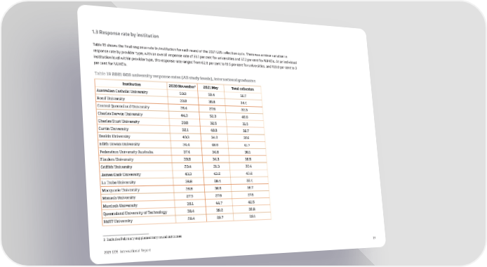 1.3 Response rate by institution Table 19 shows the final response rate by institution for each round of the 2021 GOS collection cycle. There was a minor variation in response rate by provider type, with an overall response rate of 33.1 per cent for universities and 37.2 per cent for NUHEIs. At an individual institution level within provider type, the response rate ranged from 62.8 per cent to 19.5 per cent for universities, and 100.0 per cent to 0 per cent for NUHEIs. Table 19 2021 GOS university response rates (All study levels), international graduates 3 Institution 2020 November 2021 May Total collection Australian Catholic University 50.9 59.4 56.7 Bond University 33.9 35.8 34.4 Central Queensland University 35.4 27.6 32.3 Charles Darwin University 44.3 52.3 48.6 Charles Sturt University 30.8 32.5 31.5 Curtin University 32.1 40.0 36.7 Deakin University 40.3 34.2 37.6 Edith Cowan University 34.4 48.6 41.7 Federation University Australia 37.4 34.8 36.1 Flinders University 39.9 34.3 36.5 Griffith University 29.4 31.3 30.4 James Cook University 43.3 43.2 43.2 La Trobe University 36.6 28.4 32.4 Macquarie University 36.8 36.6 36.7 Monash University 27.9 27.8 27.8 Murdoch University 39.1 44.7 42.5 Queensland University of Technology 38.4 39.2 38.8 RMIT University 28.4 29.7 29.1 3 Includes February supplementary round outcomes 2021 GOS International Report 27