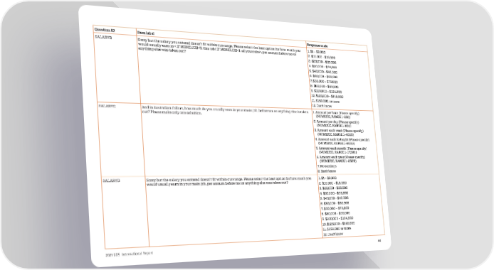 Question ID Item label Response scale SALARYB Sorry but the salary you entered doesn’t fit within our range. Please select the best option for how much you 1. $1 - $9,999 would usually earn in < IF MORE1JOB=5: this job/ IF MORE1JOB=1: all your jobs>, per annum before tax or 2. $10,000 - $19,999 anything else was taken out? 3. $20,000 - $29,999 4. $30,000 - $39,999 5. $40,000 - $49,999 6. $50,000 - $59,999 7. $60,000 - $79,999 8. $80,000 - $99,999 9. $100,000 - $124,999 10. $125,000 - $149,999 11. $150,000 or more 12. Don't know SALARYC And in Australian dollars, how much do you usually earn in your main job, before tax or anything else is taken 1. Amount per hour (Please specify) out? Please make only one selection. (NUMERIC, RANGE 1-250) 2. Amount per day (Please specify) (NUMERIC, RANGE 1-800) 3. Amount each week (Please specify) (NUMERIC, RANGE 1-4000) 4. Amount each fortnight (Please specify) (NUMERIC, RANGE 1-8000) 5. Amount each month (Please specify) (NUMERIC, RANGE 1-17,500) 6. Amount each year (Please specify) (NUMERIC, RANGE 1-250K) 7. No earnings 8. Don’t know SALARYD Sorry but the salary you entered doesn’t fit within our range. Please select the best option for how much you 1. $1 - $9,999 would usually earn in your main job, per annum before tax or anything else was taken out? 2. $10,000 - $19,999 3. $20,000 - $29,999 4. $30,000 - $39,999 5. $40,000 - $49,999 6. $50,000 - $59,999 7. $60,000 - $79,999 8. $80,000 - $99,999 9. $100,000 - $124,999 10. $125,000 - $149,999 11. $150,000 or more 12. Don't know 2021 GOS International Report 44