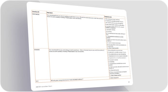 Question ID Item label Response scale RSNOMORE You mentioned that you are not looking to work more hours. What is the main reason you work the number of 1. No suitable job in my local area hours you are currently working? Please select only one answer. 2. No job with a suitable number of hours 3. No suitable job in my area of expertise 7. Long-term health condition or disability 8. Caring for family member with a health condition or disability 9. Caring for children 10. Studying 12. I’m satisfied with the number of hours I work 13. No more hours available in current position 14. Work has been reduced/shutdown due to COVID-19 15. Due to contract restrictions 16. Pursuing other interests/commitments in spare time 11. Other (Please specify) RSMORE You mentioned that you are looking to work more hours. What is the main reason you work the number of 1. No suitable job in my local area hours you are currently working? Please select only one answer. 2. No job with a suitable number of hours 3. No suitable job in my area of expertise 4. Considered to be too young by employers 5. Considered to be too old by employers 9. Caring for children 10. Studying 12. No more hours available in current position 13. Work has been reduced/shutdown due to COVID-19 14. Financial reasons 15. Due to visa restrictions/waiting for permanent residency 11. Other (Please specify) OCC What is your occupation in your ? 1. Enter occupation 2021 GOS International Report 40