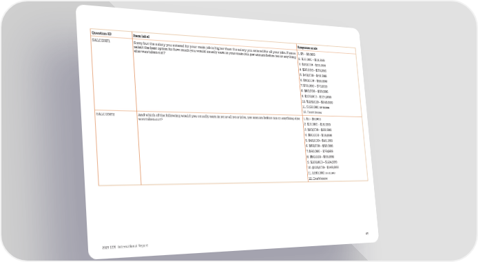 Question ID Item label Response scale SALCONF1 Sorry but the salary you entered for your main job is higher than the salary you entered for all your jobs. Please 1. $1 - $9,999 select the best option for how much you would usually earn in your main job, per annum before tax or anything 2. $10,000 - $19,999 else was taken out? 3. $20,000 - $29,999 4. $30,000 - $39,999 5. $40,000 - $49,999 6. $50,000 - $59,999 7. $60,000 - $79,999 8. $80,000 - $99,999 9. $100,000 - $124,999 10. $125,000 - $149,999 11. $150,000 or more 12. Don't know SALCONF2 And which of the following would you usually earn in your all your jobs, per annum before tax or anything else 1. $1 - $9,999 was taken out? 2. $10,000 - $19,999 3. $20,000 - $29,999 4. $30,000 - $39,999 5. $40,000 - $49,999 6. $50,000 - $59,999 7. $60,000 - $79,999 8. $80,000 - $99,999 9. $100,000 - $124,999 10. $125,000 - $149,999 11. $150,000 or more 12. Don't know 2021 GOS International Report 45