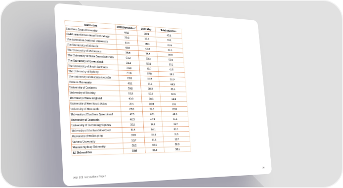 3 Institution 2020 November 2021 May Total collection Southern Cross University 44.9 39.9 43.3 Swinburne University of Technology 39.2 35.2 37.2 The Australian National University 21.2 20.6 20.9 The University of Adelaide 42.6 42.2 42.4 The University of Melbourne 38.8 35.5 36.9 The University of Notre Dame Australia 62.2 63.2 62.8 The University of Queensland 29.4 25.6 27.3 The University of South Australia 38.9 43.0 41.5 The University of Sydney 24.5 27.9 26.2 The University of Western Australia 29.9 29.8 29.9 Torrens University 40.1 51.2 44.3 University of Canberra 39.6 39.2 39.4 University of Divinity 52.9 50.0 50.9 University of New England 40.9 59.6 44.0 University of New South Wales 18.4 20.6 19.5 University of Newcastle 25.0 32.3 29.0 University of Southern Queensland 47.6 42.1 44.5 University of Tasmania 42.5 40.3 41.2 University of Technology Sydney 30.1 34.8 32.7 University of the Sunshine Coast 51.4 54.1 52.4 University of Wollongong 36.9 28.4 31.5 Victoria University 33.7 41.5 36.7 Western Sydney University 36.2 40.4 38.9 All Universities 33.0 33.2 33.1 2021 GOS International Report 28