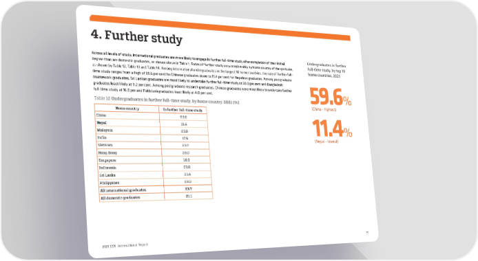 4. Further study Across all levels of study, international graduates are more likely to engage in further full-time study after completion of their initial Undergraduates in further degree than are domestic graduates, as shown above in Table 1. Rates of further study vary considerably by home country of the graduate, full-time study, by top 10 as shown by Table 12, Table 13 and Table 14. Among international undergraduates in the largest 10 home countries, the rate of further full- home countries, 2021 time study ranges from a high of 59.6 per cent for Chinese graduates down to 11.4 per cent for Nepalese graduates. Among postgraduate coursework graduates, Sri Lankan graduates are most likely to undertake further full-time study at 20.0 per cent and Bangladeshi graduates least likely at 9.2 per cent. Among postgraduate research graduates, Chinese graduates were most likely to undertake further full-time study at 16.0 per and Pakistani graduates least likely at 4.0 per cent. 59.6% Table 12 Undergraduates in further full-time study, by home country, 2021 (%) (China - highest) Home country In further full-time study China 59.6 Nepal 11.4 Malaysia 23.9 11.4% India 17.5 (Nepal - lowest) Vietnam 29.7 Hong Kong 28.0 Singapore 18.9 Indonesia 29.8 Sri Lanka 30.4 Philippines 29.3 All international graduates 33.7 All domestic graduates 21.1 2021 GOS International Report 21
