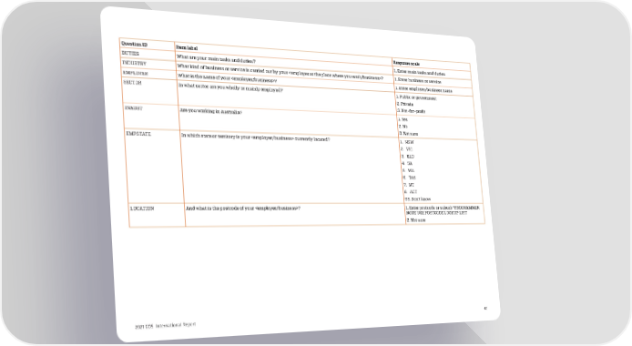 Question ID Item label Response scale DUTIES What are your main tasks and duties? 1. Enter main tasks and duties INDUSTRY What kind of business or service is carried out by your ? 1. Enter business or service EMPLOYER What is the name of your ? 1. Enter employer/business name SECTOR In what sector are you wholly or mainly employed? 1. Public or government 2. Private 3. Not-for-profit INAUST Are you working in Australia? 1. Yes 2. No 3. Not sure EMPSTATE In which state or territory is your currently located? 1. NSW 2. VIC 3. QLD 4. SA 5. WA 6. TAS 7. NT 8. ACT 98. Don’t know LOCATION And what is the postcode of your ? 1. Enter postcode or suburb *PROGRAMMER NOTE USE POSTCODE LOOKUP LIST 2. Not sure 2021 GOS International Report 41