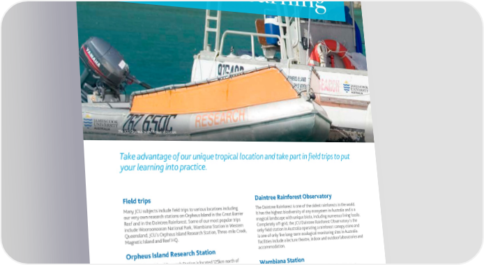 Practical Learning The JCU Orpheus Island Research Station. Take advantage of our unique tropical location and take part in field trips to put your learning into practice. Field trips Daintree Rainforest Observatory Many JCU subjects include field trips to various locations including The Daintree Rainforest is one of the oldest rainforests in the world. Get hands-on learning at JCU's Aquaculture facility. our very own research stations on Orpheus Island in the Great Barrier It has the highest biodiversity of any ecosystem in Australia and is a Reef and in the Daintree Rainforest. Some of our most popular trips magical landscape with unique biota, including numerous living fossils. include Wooroonooran National Park, Wambiana Station in Western Completely off-grid, the JCU Daintree Rainforest Observatory is the Queensland, JCU’s Orpheus Island Research Station, Three-mile Creek, only field station in Australia operating a rainforest canopy crane and Magnetic Island and Reef HQ. is one of only five long-term ecological monitoring sites in Australia. Facilities include a lecture theatre, indoor and outdoor laboratories and Orpheus Island Research Station accommodation. JCU’s Orpheus Island Research Station is located 125km north of Wambiana Station Townsville. Many subjects include field trips to the Island, which facilities include accommodation for up to 57 guests, wet and dry labs, Wambiana is a fully operational outback cattle station. The Station temperature control room laboratories, and a range of boating, SCUBA contains a range of habitats including woodlands, dense thickets, a river, diving and snorkelling equipment. a lagoon, and areas grazed at different densities. It’s a great place to spot lots of Australian wildlife, including varied macropods (kangaroos, wallaroos, wallabies and bettongs), possums, marsupial carnivores, many species of birds and a diverse array of reptiles. Enjoy nature up close and personal on our tropical campuses. Researchers in 'the crane' at the JCU Daintree Rainforest Observatory. 18 | jcu.edu.au CRICOS Provider Code 00117J CRICOS Provider Code 00117J jcu.edu.au | 19