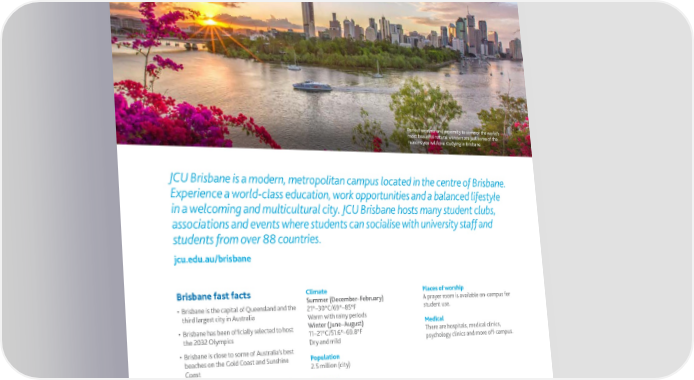 JCU Singapore JCU Brisbane Perfect weather and proximity to some of the world’s most beautiful natural wonders are just some of the Prepare yourself for the global workforce in one of the reasons you will love studying in Brisbane. most dynamic cities in the world. JCU Brisbane is a modern, metropolitan campus located in the centre of Brisbane. James Cook University in Singapore was established in 2003, as JCU’s first Experience a world-class education, work opportunities and a balanced lifestyle international campus. The Singapore campus boasts cutting-edge facilities, in a welcoming and multicultural city. JCU Brisbane hosts many student clubs, collaborative learning spaces, and internationally renowned lecturers to help you associations and events where students can socialise with university staff and succeed every step of the way. You will get the same quality educational programs students from over 88 countries. and senior academic staff as JCU students in Queensland. jcu.edu.au/brisbane jcu.edu.sg Brisbane fast facts Climate Places of worship Singapore fast facts Climate Places of worship Summer (December–February) A prayer room is available on-campus for Dry season (March–August) Two prayer rooms are available on-campus • Brisbane is the capital of Queensland and the 21°–30°C/69°–85°F student use. • As an ever-evolving city, Singapore is at the 25°–32°C/77°–90°F for student use. third largest city in Australia Warm with rainy periods forefront of global health, technology and Wet season (September–February) • Brisbane has been officially selected to host Winter (June–August) Medical economic advancement 24°–32°C/75°–90°F. Medical the 2032 Olympics 11–21°C/51.6°–69.8°F There are hospitals, medical clinics, • Be a part of this rich multicultural The JCU Singapore Psychology Clinic is Dry and mild psychology clinics and more off-campus. community. Population located on campus. A hospital is available 15 • Brisbane is close to some of Australia’s best 5.45 million (city), 4,000 (campus) minutes from the campus, as well as several beaches on the Gold Coast and Sunshine Population medical clinics around the city. Coast 2.5 million (city) Transport Two MRT (train) stations are a 10-minute Sporting facilities • Brisbane is one of the most affordable cities Transport walk from campus, and there are three bus A wide range of sporting facilities are in Australia and is known for being safe and Bus, train and ferry services are available stops within a short walking distance to the available on campus, including a gymnasium, friendly. within a short walking distance of the campus. cricket pitch, multi-purpose sports courts campus. The Brisbane International Airport is (basketball, volleyball and tennis), and an Darwin open 24/7 and is Australia’s third largest indoor multi-purpose hall for badminton airport in terms of passenger traffic. games. Cairns Kuala Lumpur Townsville SINGAPORE BRISBANE Perth Sydney Adelaide Canberra Melbourne Hobart 12 | jcu.edu.au CRICOS Provider Code 00117J CRICOS Provider Code 00117J jcu.edu.au | 13