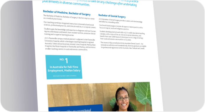 Medicine and Dentistry Be equipped with the skills to make an impact. JCU Medicine and Dentistry students gain valuable skills and experience through extensive clinical practice and graduate with the confidence to take on any challenge after undertaking placements in diverse communities. Bachelor of Medicine, Bachelor of Surgery Bachelor of Dental Surgery The Bachelor of Medicine, Bachelor of Surgery is the first step to a career JCU’s Bachelor of Dental Surgery provides students with the knowledge as a medical practitioner. and skills for a rewarding career. Our teaching combines integrated instruction in biomedical and social Our broad-based program includes all aspects of dental practice, with a sciences, professional practice, and clinical medicine, in a tropical context. focus on tropical, rural and Indigenous practice. Students gain the knowledge and expertise to diagnose and treat human Students develop practical work skills in JCU’s world-class dental teaching injuries and disease and benefit from modern facilities, extensive clinical complex, with a state-of-the-art clinical simulation laboratory, and training and a superior learning location. benefit from over 2,000 hours of clinical practice in a range of settings JCU’s Townsville campus medical precinct is adjacent to the Townsville from rural and remote communities to city areas. University Hospital, which is the largest teaching hospital in regional The course is fully accredited with the Australian Dental Council – the Australia. Other clinical locations include Cairns Hospital, Mackay Base national accreditation and standards body. Dentistry graduates are eligible Hospital, the Mater hospitals in Townsville and Mackay, and numerous for professional registration within Australia, New Zealand and Canada. smaller teaching centres in rural and remote communities. NO. 1 in Australia for Full-Time Employment, Median Salary 2022 Good Universities Guide, UG Dentistry “One of the reasons I picked JCU is the amazing amount of clinical hours that you just don’t find in the US or Canada. In total, JCU prepares you with 2,200 hours of clinical hands-on experience treating patients so you feel very “JCU provides an exceptional work ready the minute you graduate”educational experience, with plenty of placement opportunities and Tanner Pachal interactions with all walks of life.” CANADA BACHELOR OF DENTAL SURGERYSrikaveri Sriram BOTSWANA BACHELOR OF MEDICINE, BACHELOR OF SURGERY 28 | jcu.edu.auCRICOS Provider Code 00117J CRICOS Provider Code 00117J jcu.edu.au | 29
