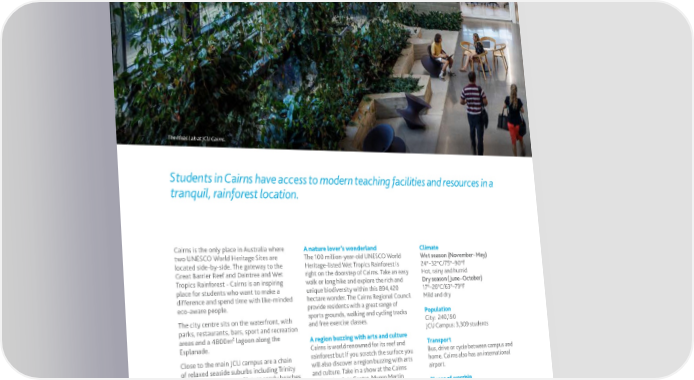 JCU Cairns The Ideas Lab at JCU Cairns. Students in Cairns have access to modern teaching facilities and resources in a Darwin tranquil, rainforest location. CAIRNS Townsville Brisbane Cairns is the only place in Australia where A nature lover’s wonderland Climate Perth Sydney two UNESCO World Heritage Sites are The 100 million-year-old UNESCO World Wet season (November–May) Adelaide Canberra located side-by-side. The gateway to the Heritage-listed Wet Tropics Rainforest is 24°–32°C/75°–90°F Great Barrier Reef and Daintree and Wet right on the doorstep of Cairns. Take an easy Hot, rainy and humid Melbourne The Laura Quinkan Dance Festival highlights the diverse communities, Tropics Rainforest - Cairns is an inspiring walk or long hike and explore the rich and Dry season (June–October) language, song, dance and stories and showcases the strength, pride and place for students who want to make a unique biodiversity within this 894,420 17°–26°C/63°–79°F Hobart uniqueness of Aboriginal peoples. difference and spend time with like-minded hectare wonder. The Cairns Regional Council Mild and dry eco-aware people. provide residents with a great range of sports grounds, walking and cycling tracks Population The city centre sits on the waterfront, with and free exercise classes. City: 240,190 parks, restaurants, bars, sport and recreation JCU Campus: 3,309 students areas and a 4800m² lagoon along the A region buzzing with arts and culture Esplanade. Cairns is world renowned for its reef and Transport Close to the main JCU campus are a chain rainforest but if you scratch the surface you Bus, drive or cycle between campus and of relaxed seaside suburbs including Trinity will also discover a region buzzing with arts home. Cairns also has an international Beach and Palm Cove. Picture sandy beaches and culture. Take in a show at the Cairns airport. dotted with palm trees, and lifeguard Performing Arts Centre, Munro Martin patrolled swimming areas. Parklands or Tanks Arts Centre, explore the Places of worship various bars and restaurants, check out one JCU’s Multifaith Chaplaincy Centre. Cairns is a clean, green city and its residents of the ocean-side markets, or explore the are passionate about protecting and rich history of the world’s oldest living Medical advancing the understanding of the region’s cultures. JCU students can access local healthcare outstanding natural environment. Industries services including dental, medical and that drive Cairns are diverse, ranging from Campuses psychological services. The Cairns Hospital tourism and health through to agriculture JCU Cairns, Nguma-bada campus, provides 24 hour acute care. and education. Smithfield, is located near the popular On-campus sport northern beaches and approximately a Gymnasium, basketball courts, sport fields 20-minute drive from the city centre. Study and a world-class mountain bike track. facilities can also be accessed at the JCU The Cairns Esplanade is a great place to enjoy a walk and grab a bite Cairns, Bada-jali campus, Cairns City. to eat. Photo credit: Tourism and Events Qld and Andrew Watson. 8 | jcu.edu.au CRICOS Provider Code 00117J CRICOS Provider Code 00117J jcu.edu.au | 9
