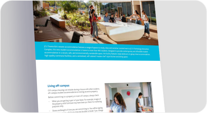Accommodation JCU Townsville’s newest accommodation features a range of spaces to study, relax and socialise. Located next to JCU’s Technology Innovation Complex, this new student accommodation is home to more than 400 students. Designed to provide contemporary and affordable student Each private bedroom has a lock and a range of features to ensure you accommodation in a secure, safe, and environmentally sustainable space, the facility features study bedrooms in group-share accommodation, can rest and study.high-quality communal facilities, and a centralised, self-catered ‘master-chef’ style kitchen and dining space. Find the right accommodation for you to call home at JCU. Living on-campus Find the right option for youLiving off-campus Living on-campus is a great way to make new friends and immerse JCU provides on-campus accommodation at JCU Townsville and JCU Off-campus housing can include sharing a house with other students, yourself into JCU and Australian culture. By living somewhere Cairns. JCU Townsville has five different accommodation options that off-campus student accommodation or renting an entire property. comfortable and conveniently close to where you study, you can house over 1,200 students, and JCU Cairns has a complex for 300 Before committing to a property or room off campus, always check: improve your overall student experience. Our on-campus options range students. Whether you need accommodation for a semester or for your from long corridor-style, fully-catered residences to smaller self-catered full degree, there are plenty of options available.− What you are getting is part of your lease. For example, images of facilities. With so many options available across our different campuses, − All rooms at our on-campus residences are single board, with a the property with furniture may have been put there for marketing you can find the perfect place to suit your needs.single bed, study desk, chair, fan, air-conditioning and Wi-Fipurposes only − Each residence has a different style of living, culture and − Dates and length of time you are committing to. You will be signing Support and securityatmosphere. There are options for fully catered meals, which can be a legal document, which you may not be able to break if you change Living on-campus is so much more than just a room. It is a safe, secure adapted to dietary requirements, or self-catered housing.your mind and fun way to study. All residences include academic, wellbeing and − The property is located close to the university campus, bus stops social support.Homestayand amenities. − Each bedroom has a lock that only you and our staff can access. With homestay accommodation, you are matched with a local family Only residents have after-hours access to any buildings from the area to live with. All homestay hosts have been:Further information and virtual tours of − Security cameras throughout the buildings. JCU security are on-each residence campus and patrol the grounds 24/7 and can escort you back to − Screened by the JCU’s homestay provider, and your residence if you are studying late at nightjcu.edu.au/accommodation − Undergo training to provide a high level of service and comfort to − Our on-campus team are here to support you. the student. There are options for full catered meals, or self-catered housing. 20 | jcu.edu.auCRICOS Provider Code 00117J CRICOS Provider Code 00117J jcu.edu.au | 21