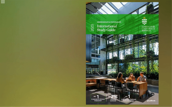 Welcome to James Cook University values and celebrates the diversity of our community and is committed to ensuring our learning and working environment is safe and welcoming. JCU is proud to be part of the Respect. Now. Always. campaign – a national initiative led by Universities Australia to highlight our determination to ensure our students and staff are safe from James Cook discrimination and sexual harassment. Further information about the campaign and free services available for students can be found at University jcu.edu.au/sew Education is vital to our shared future. It is only through education that we deepen our understanding of the world, Our commitment to Australian Aboriginal gathering the skills needed to use knowledge effectively and Torres Strait Islander peoples and grow as people able to contribute to society and shape a brighter future. Education also provides a route to access James Cook University is committed to building strong and mutually beneficial partnerships that work towards closing the employment, health and more challenging and rewarding careers. Yet education is education gap for Australian Aboriginal and Torres Strait Islander peoples. also so much more: It can let us dream, explore exciting Our students come from many backgrounds, promoting rich cultural and experiential diversity on campus. We acknowledge the Australian Aboriginal and Torres Strait Islander peoples as the Traditional Owners of the lands and waters where we operate our business. new concepts, have fun, and make lifelong friends.We honour the unique cultural and spiritual relationship to the land, waters and seas of First Australian peoples and their continuing and rich contribution to James Cook University (JCU) and Australian society. We also pay respect to Ancestors and Elders past, present and future. As you start your international education journey, our commitment and how they might enable your journey of discovery. We are committed to you is that JCU is about all these things. We are also about great to you having a student experience that is life-changing, whether it is in student experiences and exceptional academic and career outcomes. one of the most fascinating places in the world or online in the comfort All Australian universities will make the same promises, but with of your own home. JCU there is one big difference. While you study you can experience authentic learning in our own backyard across the Great Barrier Reef, The COVID-19 global pandemic and international travel restrictions Daintree Rainforest, and the great Australian outback. You can also have resulted in changes to teaching and learning at JCU, in order to work with regional and remote communities, explore ecosystems as keep everyone safe and adhere to Australian Government guidelines. living laboratories, or work in areas where climate change and the We have made adjustments to our course offerings to enable students in awesome power of nature are both fearsome and challenging. some courses to study online, and will continue to work closely with our Coming Together and Respecting Difference That’s why JCU is Uni, but not as you know it.students to ensure they gain the best possible outcome from their time For over 50 years, JCU has helped create that brighter future through studying with us, and develop the skills, knowledge and confidence to Acrylic on linen by Kassandra Savage (JCU Alumni) students and graduates who make a difference. We are committed to launch their careers.Language group: Waanyi and Walangama clan part of Gkuthaarn/Kukatj nations bringing together our natural world, the built environment, people During times of uncertainty, education increases in its importance to JCU acquired this artwork as part of our commitment to implement the Reconciliation and societies, through experiential learning. We do so with a view to you and your community and an educational experience that crosses Action Plan. The artwork represents JCU’s story in an Australian Aboriginal and Torres living the United Nations’ Sustainable Development Goals and were international borders and engages international perspectives is Strait Islander way: 1 ranked #5 in the world for our commitment to health and wellbeing. becoming more important than ever. Thank you for taking the time to • Circles in the middle depicts JCU as a meeting place We have a strong international reputation, recognised among the explore JCU. We look forward to creating a brighter future with you • Outer circles are JCU’s linkages to communities through their students who return 23 world’s top 300 universities , top 25 universities for ecology , the top that makes a difference.home to share their new knowledge and understandings 100 for earth and marine sciences4, and being independently rated five stars for starting salary, learner engagement, full-time employment, • Different patterns within the hands and arms are the differences between and within and social equity5. These achievements are hard-earned and a tribute Aboriginal, Torres Strait Islander, and multicultural Australia. There are also similarities to the commitment of academics and professional staff in supporting in the hands and arms used to illustrate us standing together for equity and equality students on their journey to becoming well-rounded graduates. • The ripple effect in the arms and hands represents our reconciliation journey; starting As you explore this guide, consider the opportunities available to you small, growing bigger and reaching out to touch more and more lives. The effect gathers momentum to develop support and understandings. The circles represent the Professor Simon Biggs importance of yarning circles, meeting circles, and communities, in order that we can Vice Chancellor and President connect with each other. This publication is intended as a general guide for prospective international students. All applicants should contact the University to con