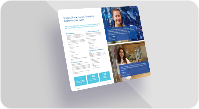 Science, Marine Science, Technology, Engineering and Maths With access to a unique tropical learning environment and the Great Barrier Reef right on our doorstep, JCU students are ready to lead in a fast-paced world. Bachelor of Science Master of Science 1.5 years (full-time) “James Cook University has a very good support system, so there is always The JCU Bachelor of Science is a flexible program, allowing students to This flexible course includes a range of diverse majors and electives to someone to ask for help if you need it, whether it’s with academic writing or if tailor their studies to suit their interests and career plans. The degree allow students to extend and specialise core knowledge components. covers the fundamentals of science in year one. Students then select one Students learn from research and industry experts through practical you just want to talk to somebody. Café International on Tuesday mornings is a or two majors to continue to build knowledge and skills in their chosen experiences in varied environments. great way to meet other international students studying at JCU.” discipline areas. Students undertake research in unrivalled locations including the World- Majors available: Vesla Hauan Nilsen Heritage listed Great Barrier Reef and Daintree Rainforest, and learn in state- • Aquaculture Science and Technology of-the-art research and teaching facilities such as JCU’s Science Place. • Environmental Earth Science NORWAY Students can choose one or two majors. • Environmental Management BACHELOR OF SCIENCE Majors available: • Fisheries Science and Management • Aquaculture Science and Technology • Geology • Chemistry • Global Change Biology • Data Science • Marine Biology • Earth Science • Tropical Biology and Conservation. • Marine Biology Master of Science (Professional) 2 years (full- • Mathematics time) • Molecular and Cell Biology • Physics The Master of Science (Professional) includes the same majors as the • Zoology and Ecology. Master of Science, but also includes advanced coursework subjects and either an independent research project or an industry-based project. The A Bachelor of Science (Honours) degree is available to high-achieving research project is a pathway towards a PhD by research program. students. Majors available: Bachelor of Marine Science • Aquaculture Science and Technology • Environmental Earth Science Pursue your passion for the ocean and marine life while studying in JCU’s • Environmental Management advanced research aquariums and laboratories. • Fisheries Science and Management Undertake research at the JCU Orpheus Island Research Station, or at coral • Geology reefs, islands and seagrass and mangrove environments. Build capabilities in the use of seabed mapping and fish assessment sonar, oceanographic • Global Change Biology sensors, and use a range of technologies to gather data above and below • Marine Biology the waves. • Tropical Biology and Conservation. High achieving students can continue their studies through the Bachelor of Science (Honours) degree. “There are so many opportunities to get hands-on experience in the field. If you are interested in volunteering and going on field trips, you just need to look, you NO. 1 TOP 100 NO. 25 will find them!” in the world for Marine in the world for Earth in the world Sanna Perrson and Freshwater Biology and Marine Sciences for Ecology SWEDEN BACHELOR OF MARINE SCIENCE 2017 Center for World University Rankings (CWUR) 2022 QS World University Rankings 2021 Global Ranking of Academic Subjects (GRAS) 32 | jcu.edu.au CRICOS Provider Code 00117J CRICOS Provider Code 00117J jcu.edu.au | 33
