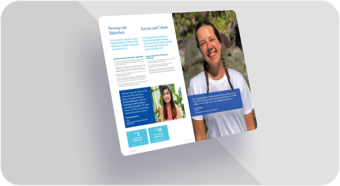 Nursing and Society and Culture Midwifery JCU is a leader in regional, rural and JCU Humanities, Creative Arts and tropical healthcare sciences with an Social Sciences programs empower emphasis on authentic learning and critical and creative thinking. Graduates compassionate care. have strong analytical skills and a solution-based approach. Bachelor of Nursing Science [Pre-registration] Master of Social Work (Professional The JCU Bachelor or Nursing Science [Pre-registration] prepares students Qualifying) for careers in multiple settings from large metropolitan hospitals to rural Our Master of Social Work (Professional Qualifying) program is recognised and isolated practice clinics. by the Australian Association of Social Workers. Students learn how to assess clients, communicate with people from diverse Subjects cover the unique and complex challenges of social work, cultural backgrounds, plan and implement nursing interventions, and including global issues and international perspectives. manage and evaluate nursing care in this professionally-accredited degree. Extensive supervised professional practice and clinical experience in real Students gain practical professional experience and acquire valuable world settings starts from year one. hands-on experience working with individuals, families, groups and communities through on-campus classes and residential workshops. Benefit from JCU’s reputation as the Centre for Nursing and Midwifery Research, and the World Health Organisation’s Collaborating Centre for Nursing and Midwifery Education and Research Capacity Building. Graduates will be eligible for registration as a Registered Nurse (Division 1) with the Nursing and Midwifery Board of Australia. “We don’t only study what’s written in the book. They invite guest lecturers from the profession, from the field itself, so it gives us knowledge of what is going on currently in the market. The entire “It is refreshing to find the curiosity and interest in every student on campus. course curriculum is outstanding We are all here because we want to learn and not because we must. And that and that’s the reason I’m here.” willingness to learn reflects in everyone’s engagement and openness.” Chandandeep Patel Carmen Bittner INDIA GERMANY MASTER OF SOCIAL WORK (PROFESSIONAL QUALIFYING) BACHELOR OF NURSING SCIENCE (PRE-REGISTRATION) NO. 2 TOP 20 in Australia for in Australia for Median Salary Social Sciences 2022 Good Universities Guide, UG Nursing 2021 Quality Indicators for Learning and Teaching (QILT) Graduate Outcomes Survey, PG study area 30 | jcu.edu.au CRICOS Provider Code 00117J CRICOS Provider Code 00117J jcu.edu.au | 31